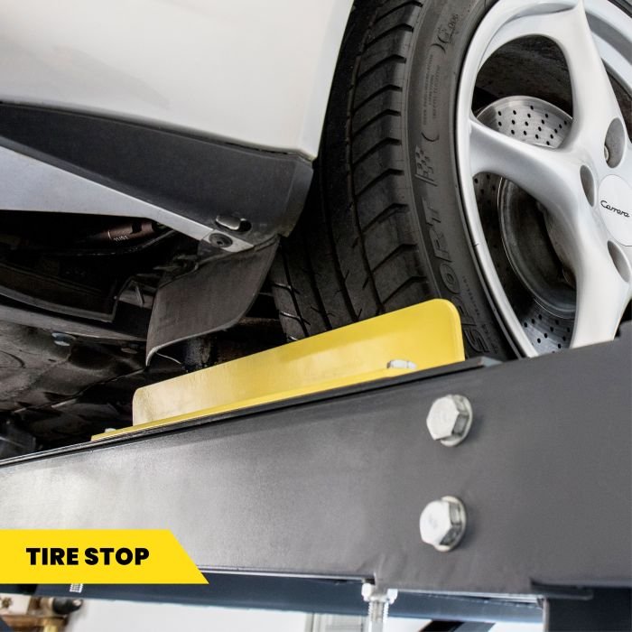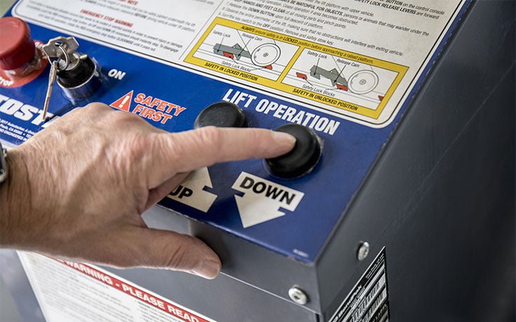 A cantilevered torsion bar extends off the lift and contains the push-button UP and DOWN controls. This ergonomically designed console is extremely safe and easy to use. Always keep an eye on your surroundings before and during car lift operation.