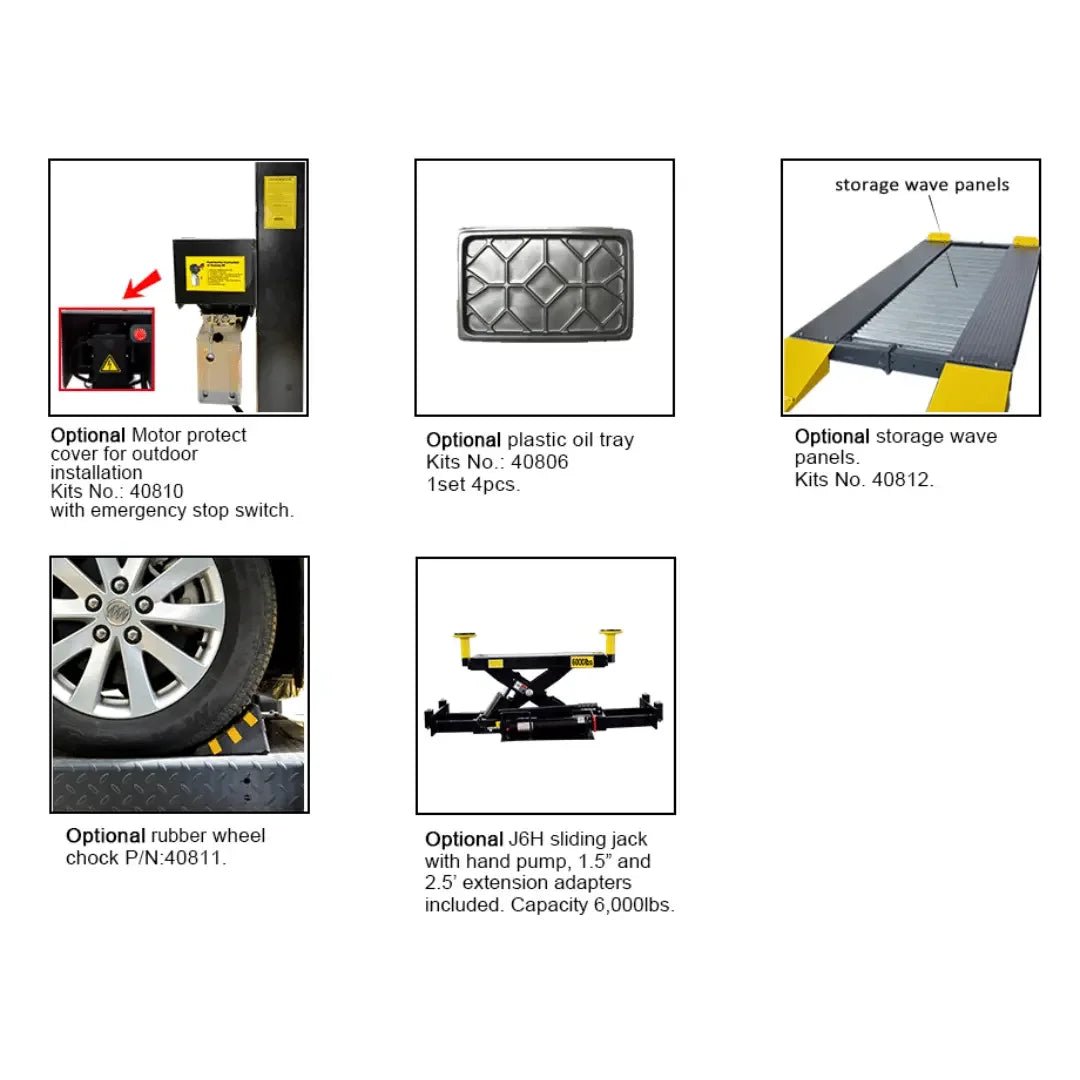Boasting a combined lifting capacity of 9,000 lb (up to 6,000 lb per vehicle), the 4 post auto lift includes a range of safety and convenience features: