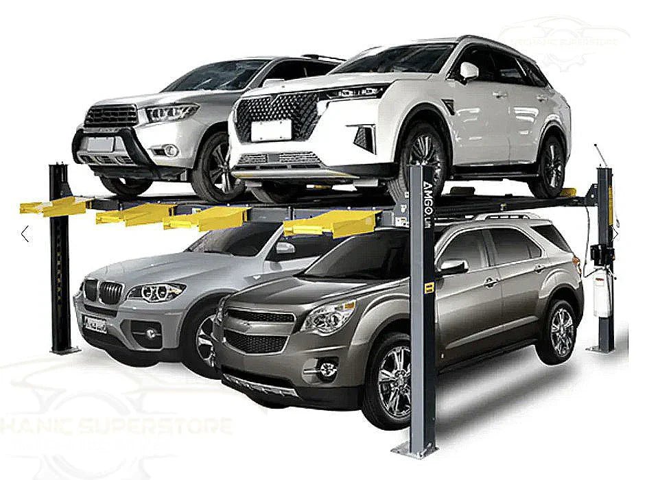 The AMGO 409-DPX 9,000 lb double parking 4 post car lift expands capacity and functionality for residential and commercial garages alike. This advanced 4 post vehicle lift features a longer and taller design compared to the standard model, creating more vertical space beneath for taller vehicles like SUVs or light trucks.