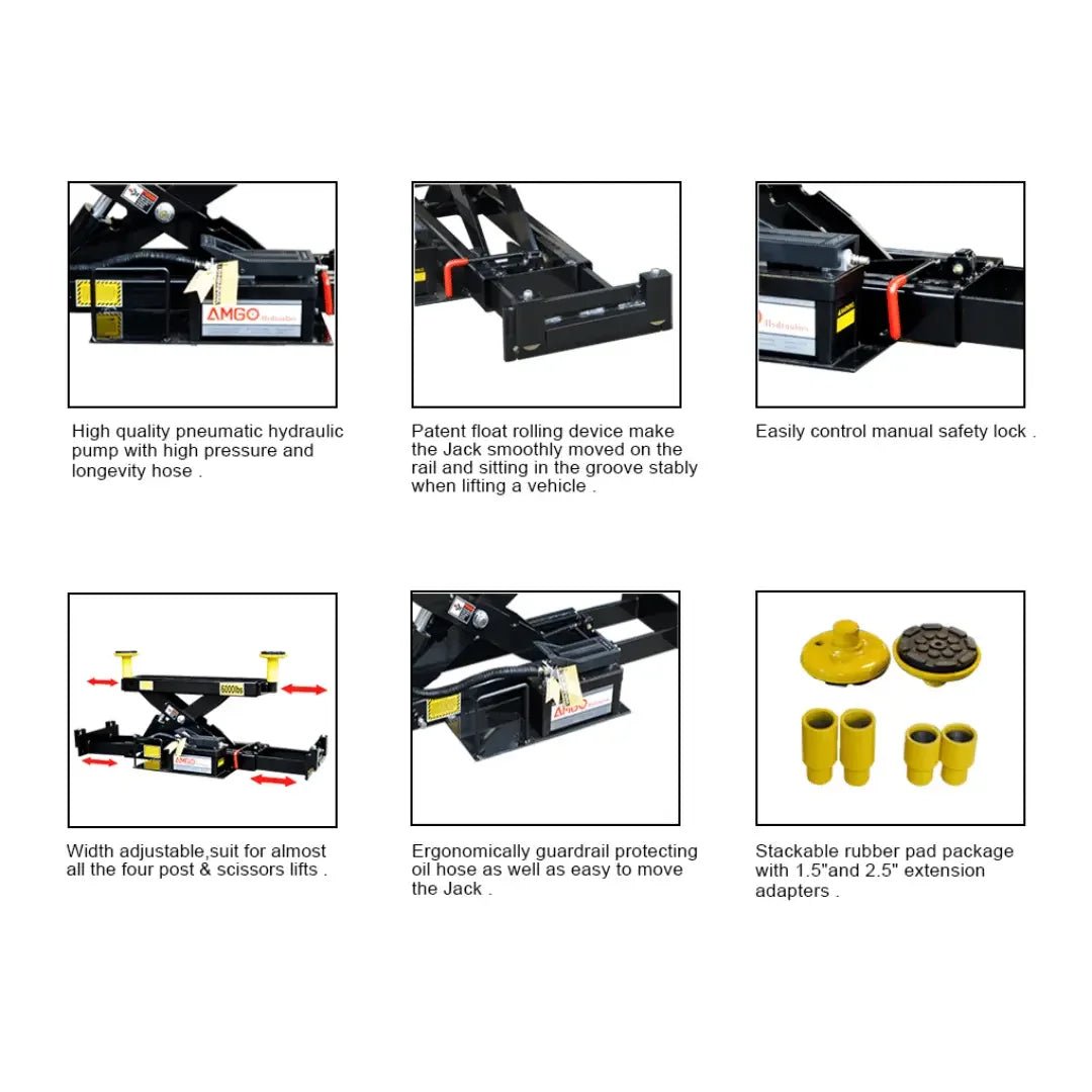 AMGO J6A is an ideal addition to any four-post & scissors lift below 12,000lbs capacity. Serving as an upgraded version of J6H, the J6A offers almost same features such as floating rolling technology and low profile design. The main improvement lies in the pump, utilizing AMGO pneumatic hydraulic pump instead of handle pump to offer a more convenient operation.