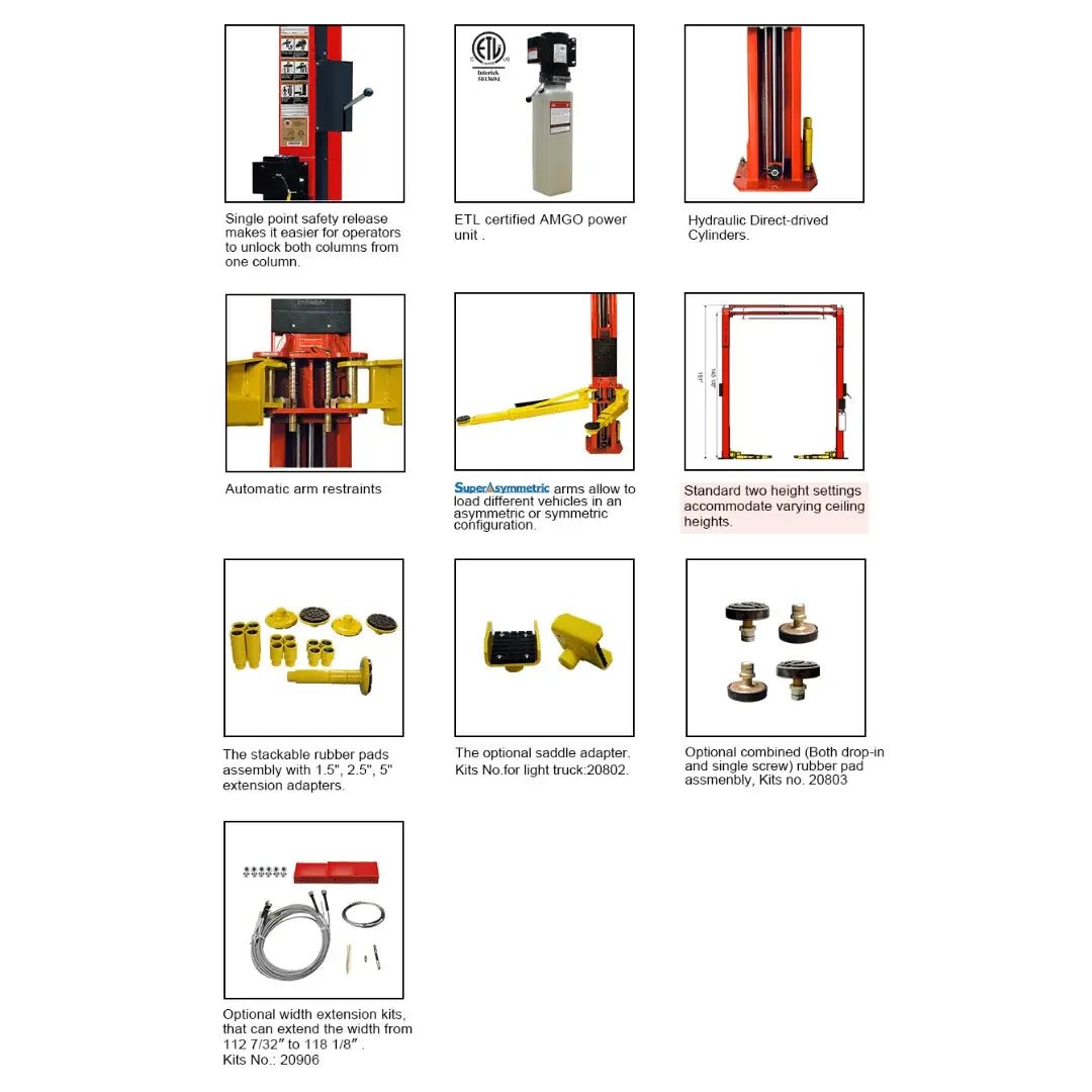 Elevate your automotive service capabilities with the AMGO OH-10 2 Post Car Lift, a cutting-edge solution designed to enhance the efficiency and safety of vehicle maintenance and repair operations. This sophisticated piece of equipment, engineered to meet the rigorous demands of modern automotive workshops, combines robust construction with innovative features, ensuring it stands out as a superior choice for professionals seeking reliability and performance.