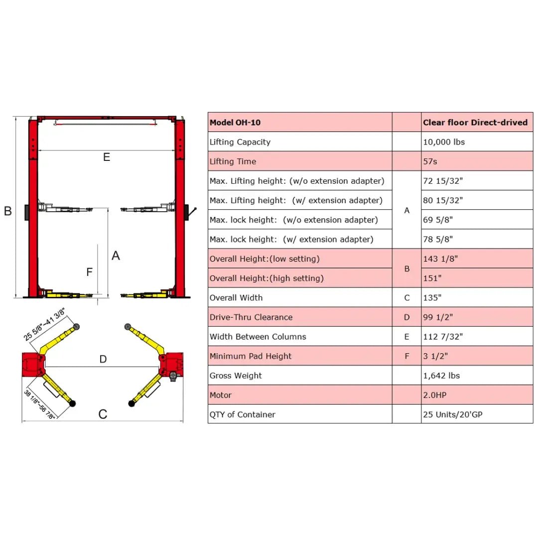 With a lifting capacity of 10,000 lbs and adjustable lifting heights ranging from 71 1/2″ to 80 1/2″, the AMGO OH-10 is versatile enough to handle a wide array of vehicles. It’s also backed by extensive warranties, including five years on steel components, three years on hydraulic parts, and two years on electrical components, underscoring AMGO’s commitment to quality and customer satisfaction. CE approved and meeting or exceeding the standards prescribed by European Standard EN-1493, this lift is a safe and reliable choice for any automotive workshop.