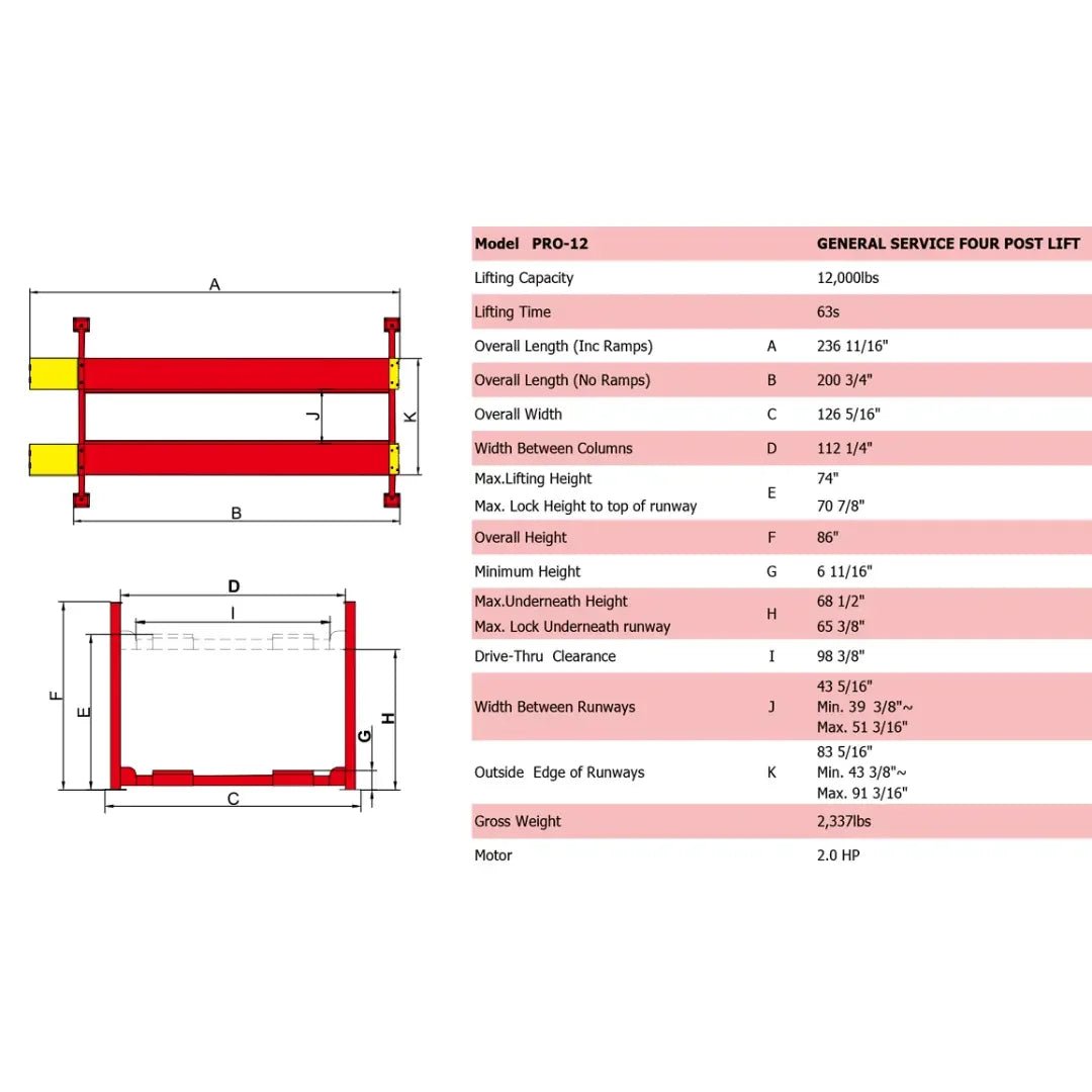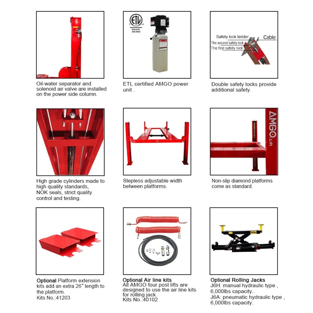 The Amgo PRO-12 12,000 lb 4-Post Lift is designed for automotive shops, dealerships, and serious enthusiasts who need reliable heavy-duty lifting capacity. With a 12,000 lb weight rating, this lift easily accommodates cars, SUVs, vans, and light-duty trucks. Its robust steel structure and precision engineering ensure long-term durability, while the ETL-certified power unit guarantees safe and consistent performance.
