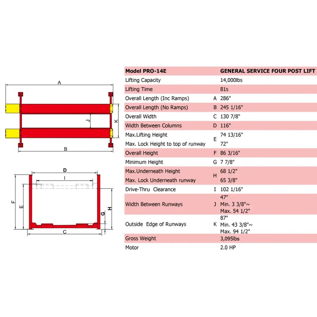The AMGO Pro-14E is a high-capacity 4 post vehicle lift engineered to handle long-wheelbase vehicles with poise and power. With an impressive 14,000 lb lifting capacity and runway platforms that are roughly 28″ longer than standard models, it’s tailor-made for vans, trucks, RVs, and other oversized workhorses.