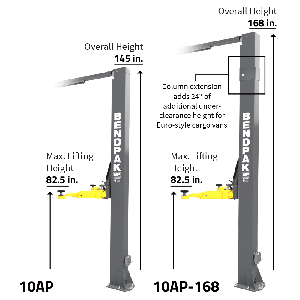 The 10AP two-post lift offers exceptional direct-drive lifting performance. This industrial-strength car lift guarantees cutting-edge technology, top of the line materials, a design that’s ahead of its time and a 10,000-lb. lifting capacity.