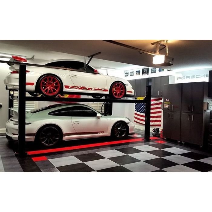 The HD-9XL four-post lift features wide drive-thru clearance and a standard lift-height but with extended runways for accommodating longer wheelbase vehicles. About the size of a typical parking space, these lifts truly maximize valuable floor space. Use them for storing cars and trucks, ATVs, snowmobiles, jet skis, golf carts, boats or just about anything else that needs to be up off the ground and safely in the air. If you’ve got at least a standard 8-foot ceiling, you’ll be able to make use of that wasted vertical space above your car. And optional caster kit allows you to roll the lift outside or wherever best suits your need.