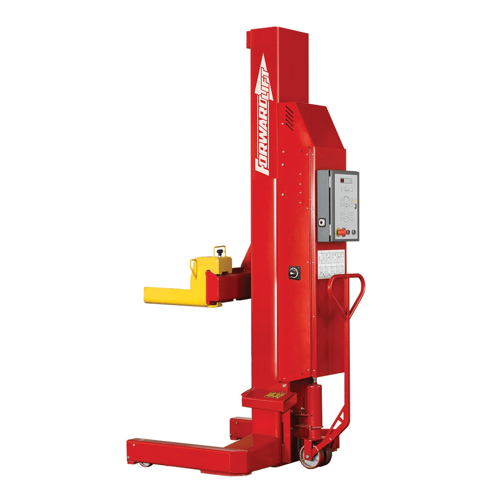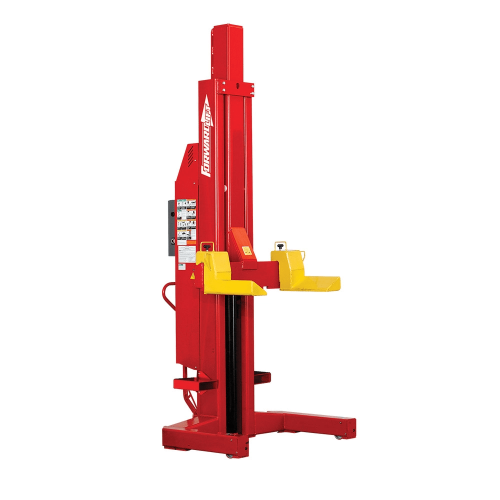 Forward’s FCHW18 Mobile Column Lifting System is for a forward thinker who doesn’t want to tie up space in their workshop with a permanent lift structure. Battery operated with an internal charger you plug these lifts into any standard 110-volt receptacle and it’ll charge the DC batteries inside. Once the charge is full there’s no clutter of power cords in the service bay and you can move them to any bay you choose. Integrated fork pockets let you pick up the lift if you need to move it outside, otherwise, you can freely move the lift yourself with an automatic steering system. Just move the handle down, no need to pump the jacks up to move the column.