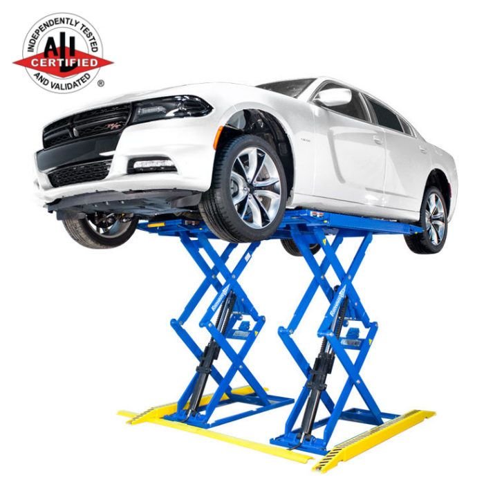 The lift features a patent-pending inverse piston manifold system that fully synchronizes the platform movement during lifting and lowering cycles, eliminating the need for a connecter bar between platforms that creates an obstruction on other scissor lifts. The same system offers blocked platform functionality that prevents both platforms from lowering if one platform is stopped by an obstruction or engaged lock, protecting the vehicle and the technician.