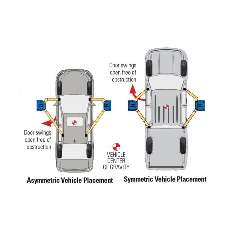 Frame engaging rubber padded truck adapters with multiple extensions to raise most vehicles on the road today. Includes four (each) adapter extensions at 3.5″ and 5″. Spot-Rite™ 3-Stage Front Arms to accommodate vehicles both symmetrically and asymmetrically. This feature allows the technician to position the vehicle doors in front of or behind the column to prevent door damage.