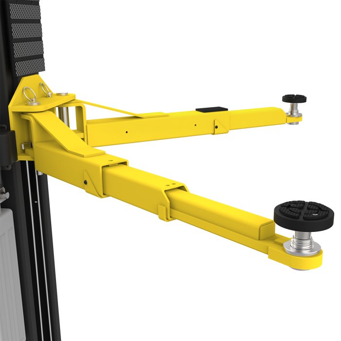Rugged box-beam overhead structure reinforces the lifting frame, reducing stress on the columns and enhancing stability. For added protection, a padded overhead shutoff bar, paired with an industrial-grade limit switch, acts as a safeguard—stopping the lift if a vehicle is raised too high. For added security, automatic arm restraints secure the arms in place when the lift is raised, preventing unintended movement during service.