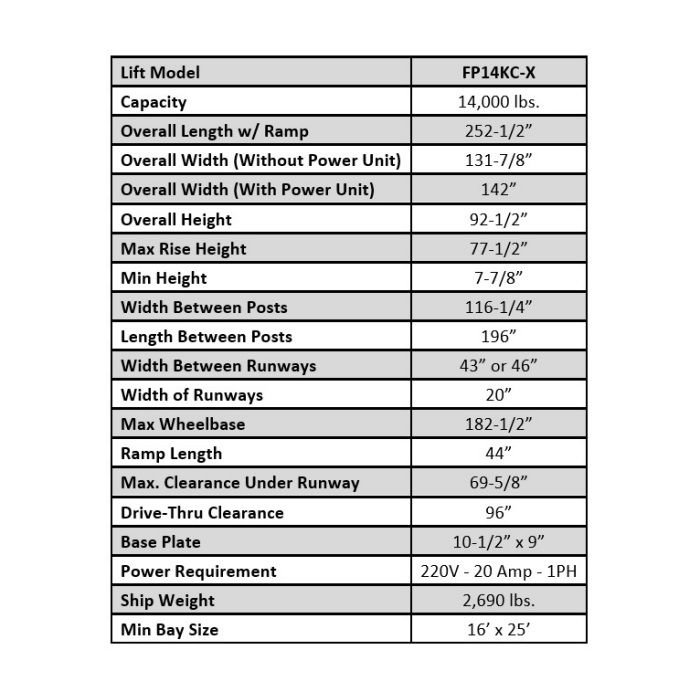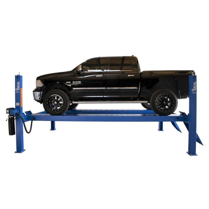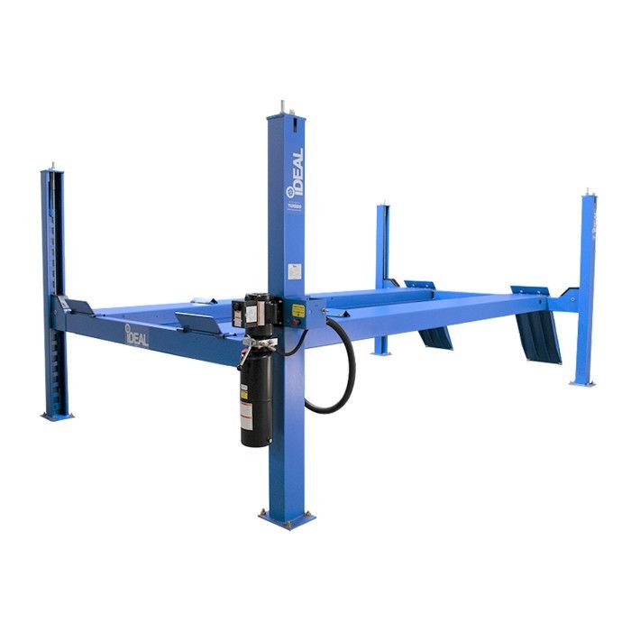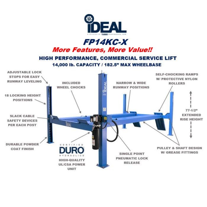 The iDEAL FP14KC-X 14,000 lbs. Four Post Commercial Service Lift is a high-performance closed front, cable pull vehicle lift designed for Cars, SUVs, Vans & Trucks. The FP14KC-X Service Lift includes the latest in design & safety features including, narrow & wide runway mount positions, extended rise height for greater undercarriage vehicle access, concealed hydraulic / mechanical cable lift system with slack cable safety devices and durable pulley & shaft design incorporating convenient grease fittings to extended life of the lift.