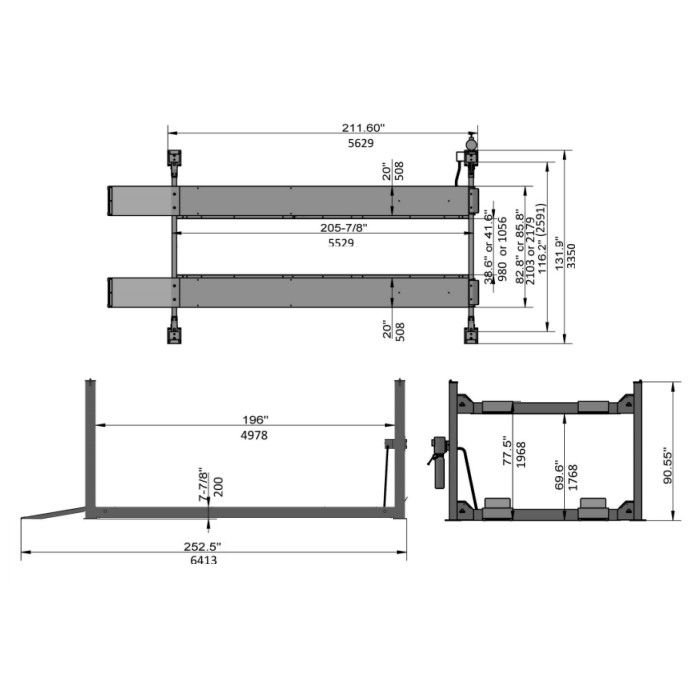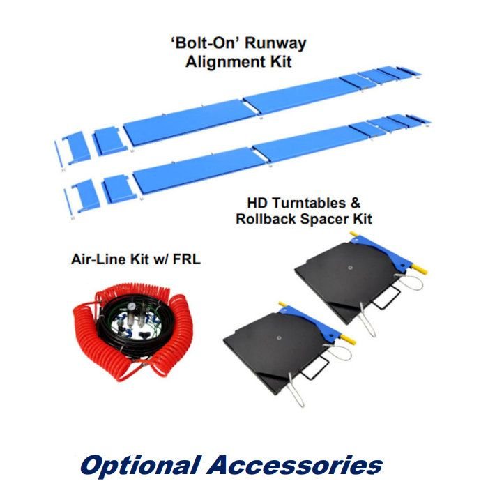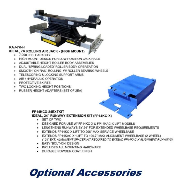 Easy lift operation is provided with single point pneumatic lock release & high quality DURO power unit, while providing additional safety & protection with self-chocking ramps and included wheel stops. The iDEAL FP14KC-X modular design provides the flexibility to extend the runways for servicing longer vehicles, while also providing the ability to convert into a high-quality Alignment Lift quickly & easily! The standard provided powder coat finish, 20″ wide runways, adjustable lock stops for easy runway leveling and optional power unit mount positions complete the package for a premium, high quality service lift, all at an unmatched value!