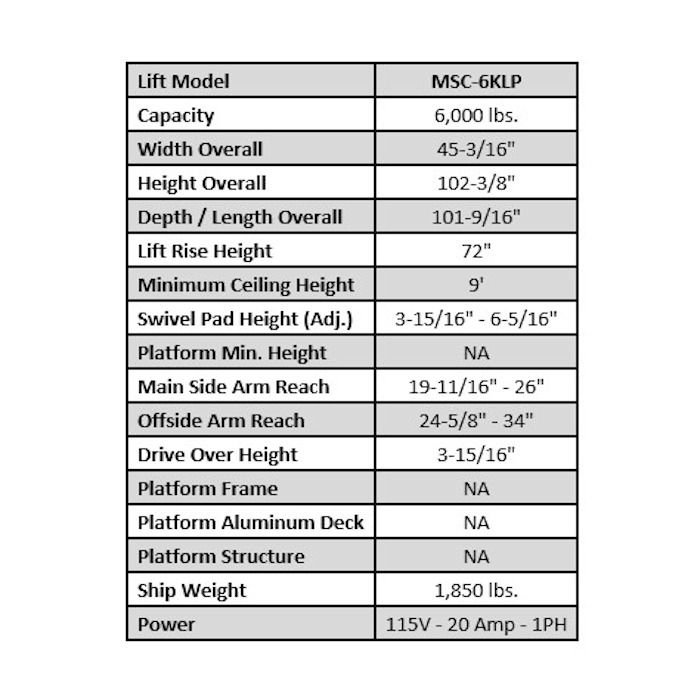 The MSC-6KLP Single Column Mobile style lift features fully adjustable arms and is designed to work on a smooth surface. The portable MSC-6KLP conveniently rolls under the vehicle uses the unique drive over design to easily position lifting points.