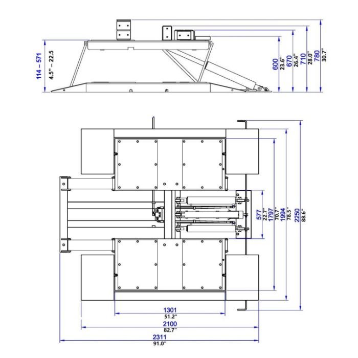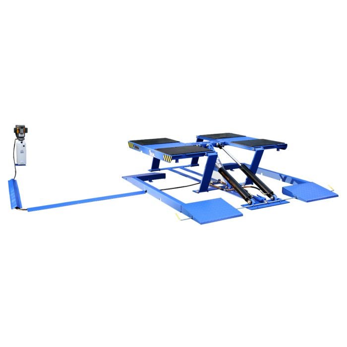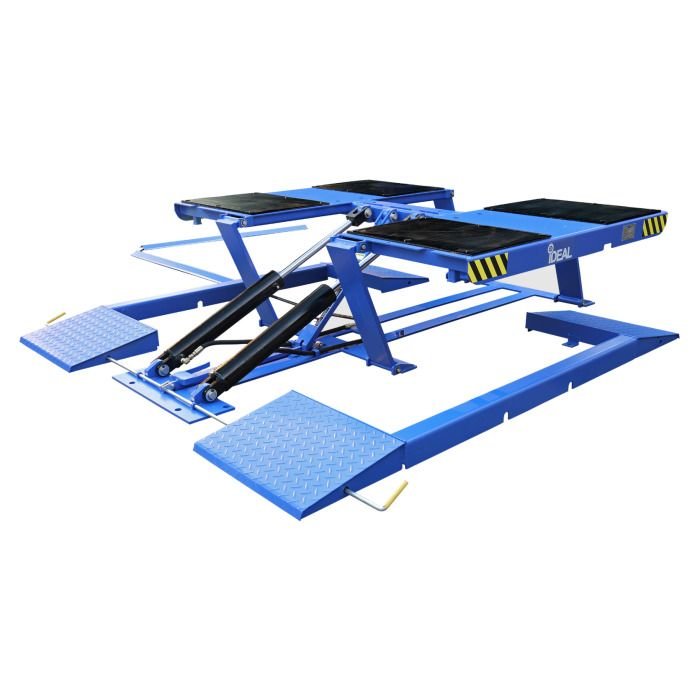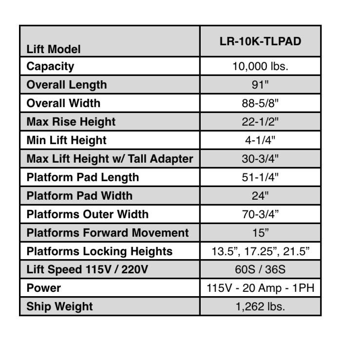 The iDEAL LR-10K-TLPAD is a 10,000 lbs. low-rise, high performance commercial, vehicle frame contact lift designed for cars, SUVs, vans & trucks. The LR-10K-TLPAD Pad Lift includes the latest in design and safety features including twin hydraulic cylinders, three locking height positions with dual latch releases, durable rubber contact pads, protective hose covers and outer drive-over fixed platform frame allowing for wheel service repairs for a wider range of vehicles, including uni-body vehicles using the included multi-height adapters and rubber pads. The versatility of the pad lift design allows vehicles to be driven-on the pad lift in either direction, while also having the ability to position the hose and power unit to either side of the pad lift, allowing for the best fit in a shop or garage. Easy lift operation is provided with high quality electric / hydraulic 115V DURO power unit, mounted to a pedestal post combined with dual point manual lock release. Optional 220V DURO power unit is also available for faster speed of rise.