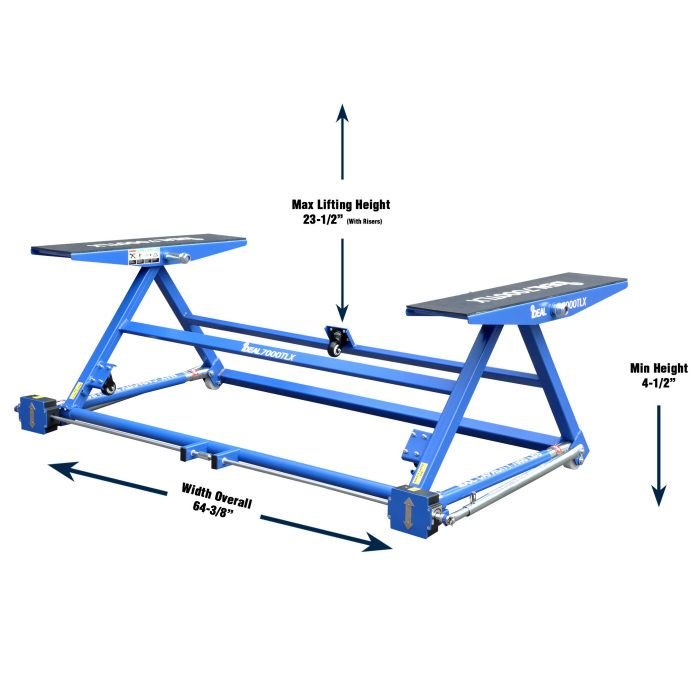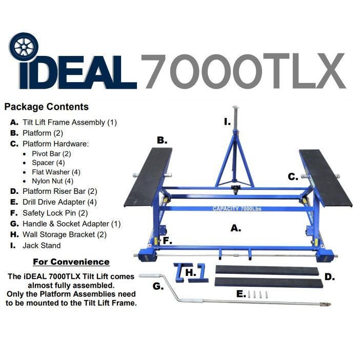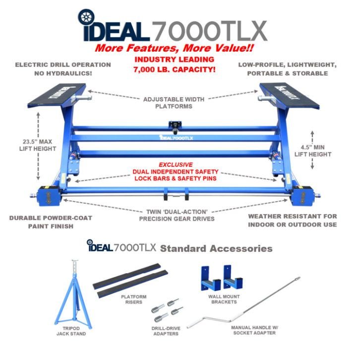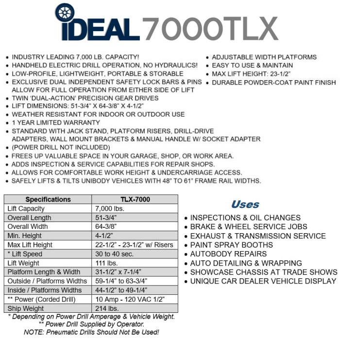 The iDEAL TLX-7000 is one of the most economical, unique, versatile & convenient vehicle lifting solutions in the market today. The iDEAL TLX-7000 is a low-profile, lightweight, portable 7,000 lb. capacity low-rise scissor frame contact tilt lift designed for unibody type passenger & small sport utility vehicles.