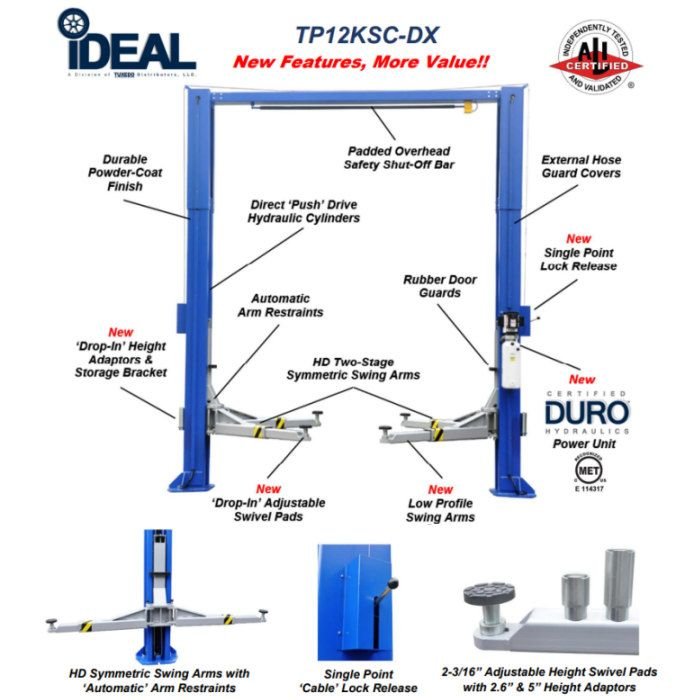 The New iDEAL TP12KSC-DX 12,000 lb. ALI Certified Heavy Duty Two Post Lift is a premium symmetric design clear floor vehicle lift with the latest design features, now including low profile swing arms, adjustable swivel pads & single point cable lock release. The symmetric arm configuration provides stable lifting, making it perfect for super duty & light duty trucks along with most passenger cars. The direct ‘push’ drive cylinders, hose & door guards and automatic arm restraints complete the package for a premium, high quality lift, all at a great value! Plus it’s ALI and ETL Certified.
