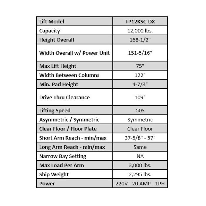 The TP12KSC-DX is a true beast of a lift. It features a direct drive two piece column with overhead shut off safety bar. Symmetric lifting is best for larger trucks, but the wider distance between the columns offers better door opening capabilities. And the 5″ lowered pad height will be low enough to allow most passenger cars on the lift. Includes 2″ and 4″ stackable height extension adapters and a single point safety release. The made in USA power unit outperforms the typical “economy” auto and truck lifts out there, and don’t forget, it’s ALI Certified, you can rest assured that you’re getting a quality product. You simply cannot find a better value.