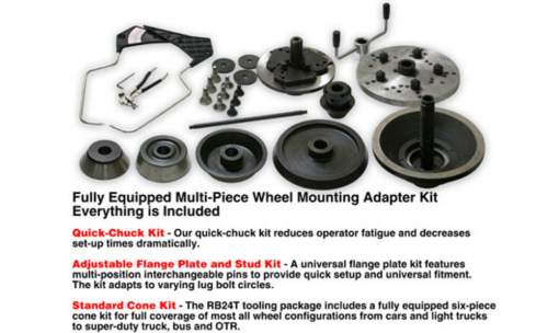 The RB24T tooling package includes a fully equipped six‐piece cone kit for full coverage of most all wheel configurations, from cars and light trucks to super‐duty truck, bus and OTR. This well‐equipped package includes five standard cones and one dual tapered cone. Individual cone sizes: 2.00” ‐ 2.75”, 2.75”‐ 4.00”, 4.00” – 5.75”, 6.00” – 6.50”, 6.75” – 8.00”, 8.25” – 9.00”, and 10.75” – 11.50”.