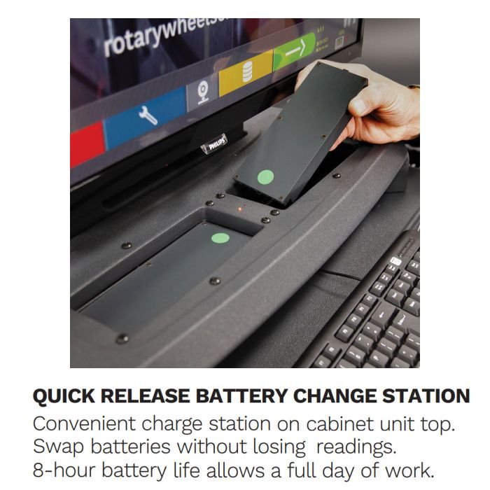 Convenient charge station on cabinet unit top. Swap batteries without losing readings. 8-hour battery life allows a full day of work.