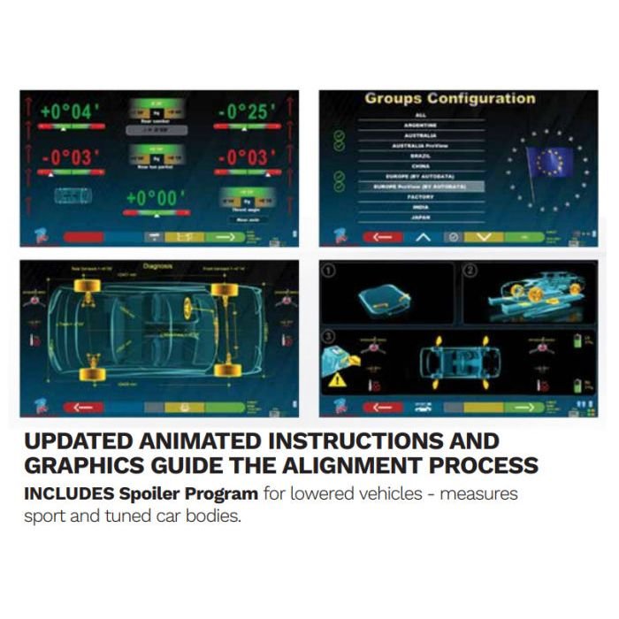 Updated animated instructions and graphics guide the alignment process. Includes “Spoiler Program” for lowered vehicles – measures sport and tunes car bodies.