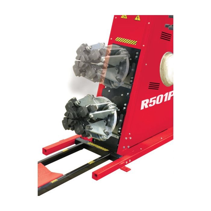 The patented operating system of the R501Plus tire changer is one of a kind. With this distinctive design, the changer is equipped with four rollers positioned on both sides of the wheel in diametrically opposite positions. With this system, the dismounting of the tire is a simple operation: while the front bead breakers keep the bead in the drop center, the rear breakers continue their course until the dismounting is complete.