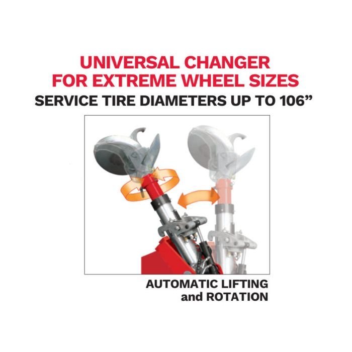 SPECIAL ORDER ELECTROHYDRAULIC CHANGER FOR TRUCKS, AGRICULTURAL AND EARTHMOVING VEHICLES. HIGH BEAD BREAKING FORCE The considerable bead breaking force makes mounting and demounting tires effortless. MULTIPLE ADJUSTABLE GUIDESThe electro-brake allows immediate stopping of the rotation to avoid any damage to tires.STAND-BY FUNCTIONAfter 5 sec. the machine has not been used, the motor will turn off.